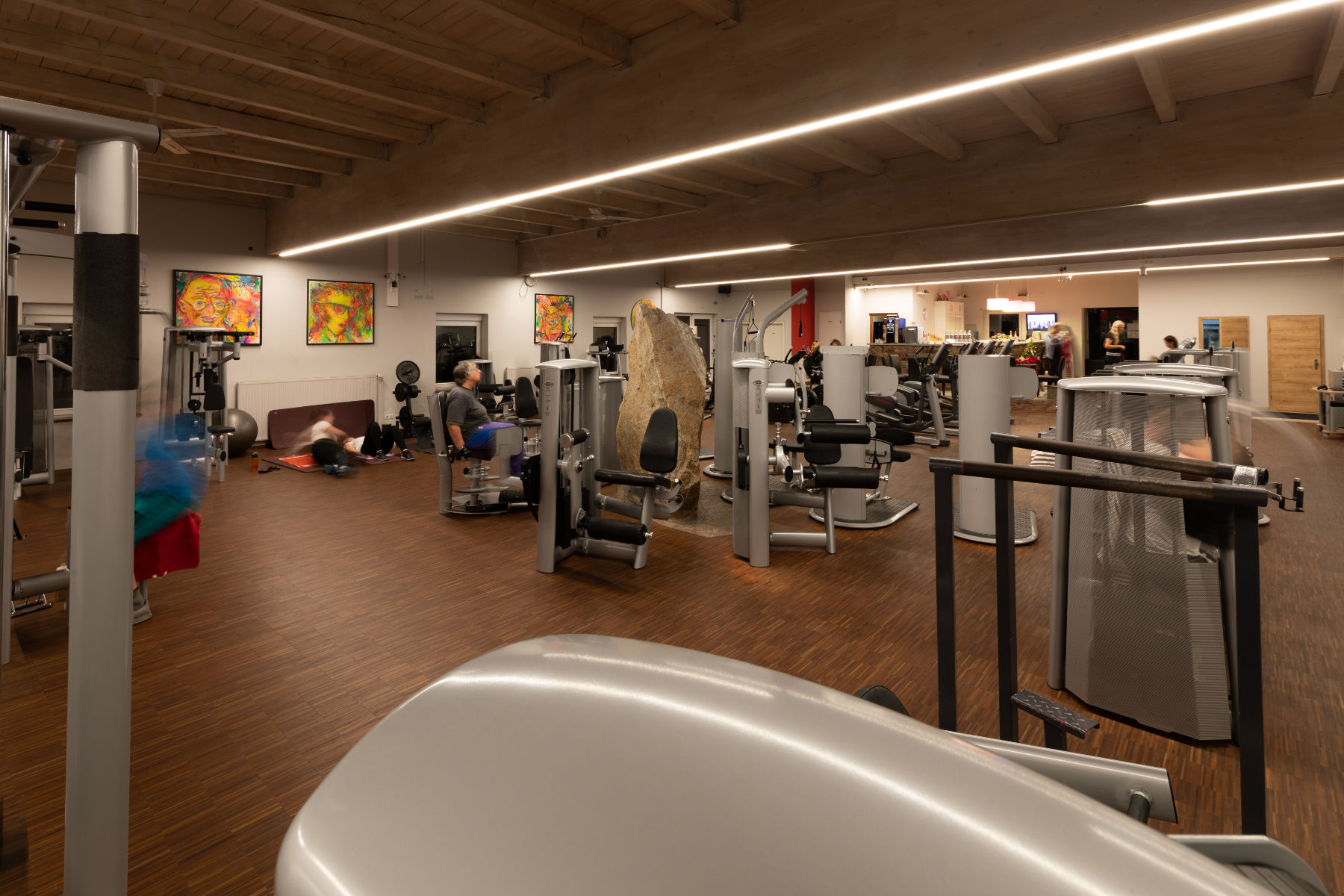 Der großzügige Trainingsbereich bietet durch den unmittelbar angegliederten Freihantelbereich die Möglichkeit zum intensiven Kraft- und Koordinationstraining. Hier ist das Repertoire an Übungen praktisch unerschöpflich. Trainer helfen gerne.